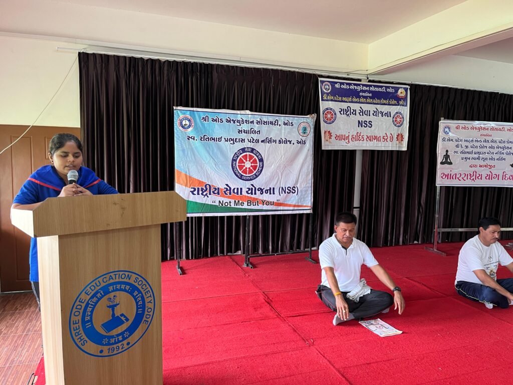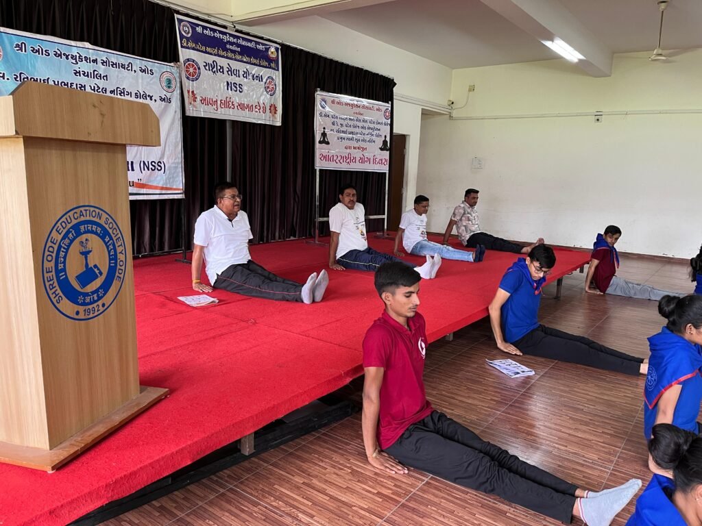 ઓડ, તા. 20 જૂન 2025 – શ્રી ઓડ એજ્યુકેશન સોસાયટી સંચાલિત વિવિધ કોલેજ સંસ્થાઓમાં આજે ભવ્ય રીતે આંતરરાષ્ટ્રીય યોગ દિવસની ઉજવણી કરવામાં આવી હતી. આ કાર્યક્રમ નર્સિંગ કોલેજના પ્રાંગણમાં યોજાયો હતો, જેમાં અનેક વિદ્યાર્થીઓ અને સ્ટાફ સભ્યોએ ઉત્સાહભેર ભાગ લીધો હતો.